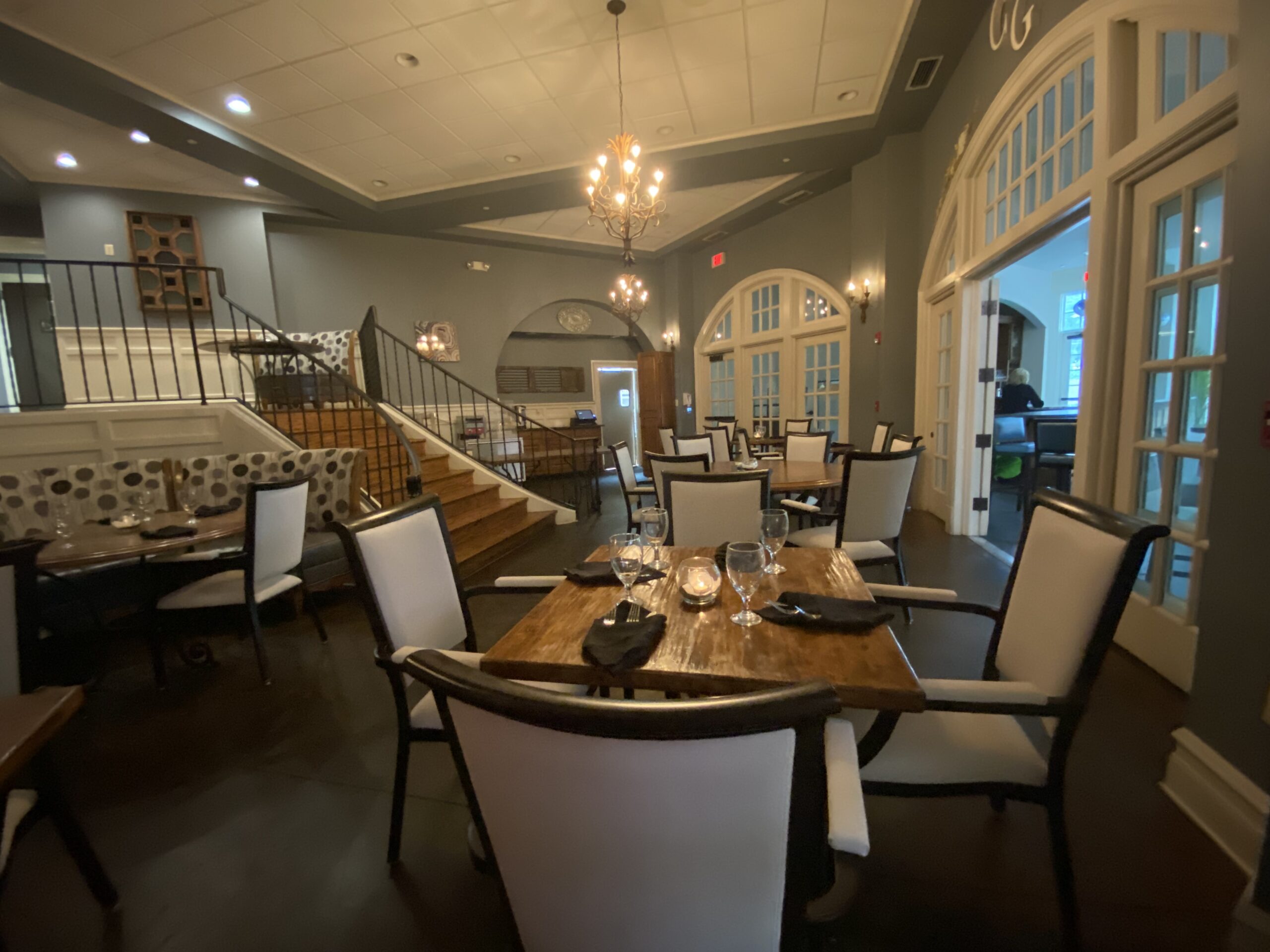 There are a variety of room options that are available for your dining experience at Cristina Gray’s. The Partner’s Room is a private dining area that was originally the living room of the Adams family home. The main feature of the Partner’s Room is a large dining table that seats up to 12 people and is cozily placed next to a beautiful gas fireplace. The finer details of this room include decorative crown molding and mahogany pocket doors which can be closed to create a more intimate setting.
